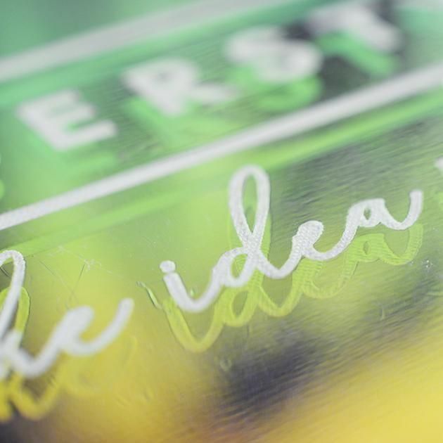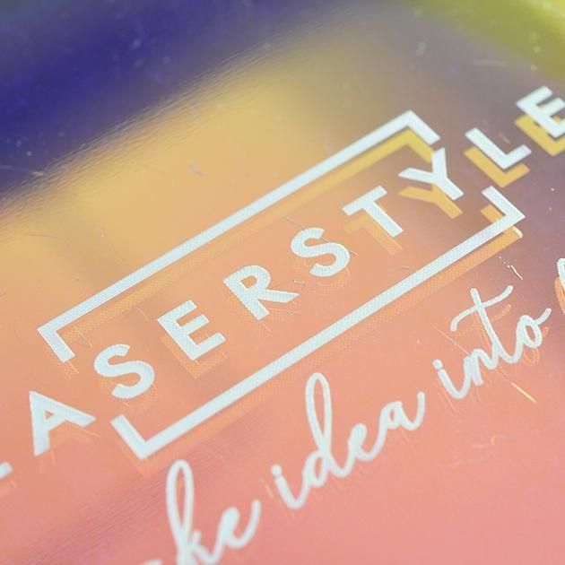 透明保護フィルム側に彫刻を施すと、逆面のレインボーミラーに彫刻が反射して二重になり、